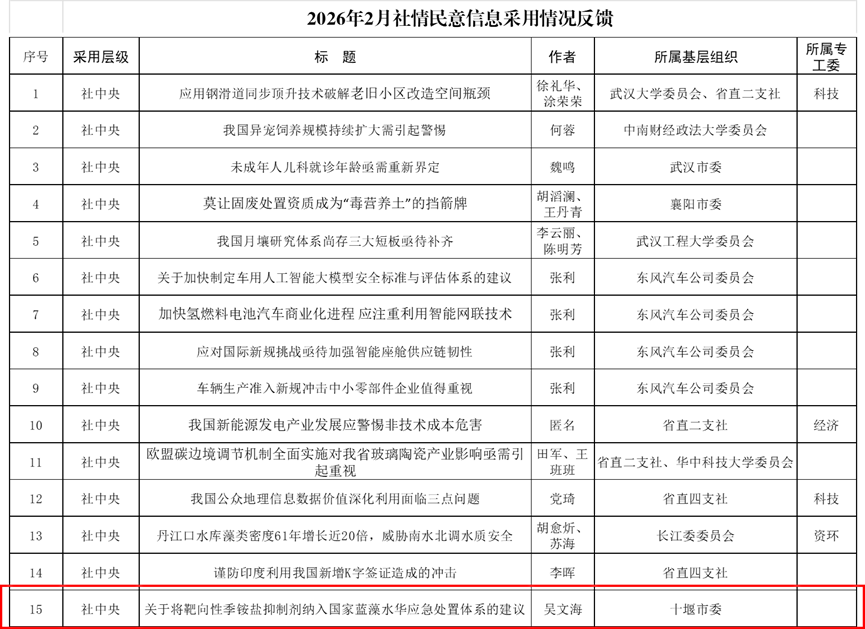 近日,从九三学社湖北省委员会获悉,我校化学与环境工程学院副教授、九三学社汉江师范学院支社社员吴文海撰写的社情民意信息《关于将靶向性季铵盐抑制剂纳入国家蓝藻水华应急处置体系的建议》被九三学社中央委员会采用。这是我校教师在社情民意信息工作中实现社中央层面的又一突破,标志着我校在服务国家战略需求和地方生态环境治理方面的建言献策能力持续提升。
