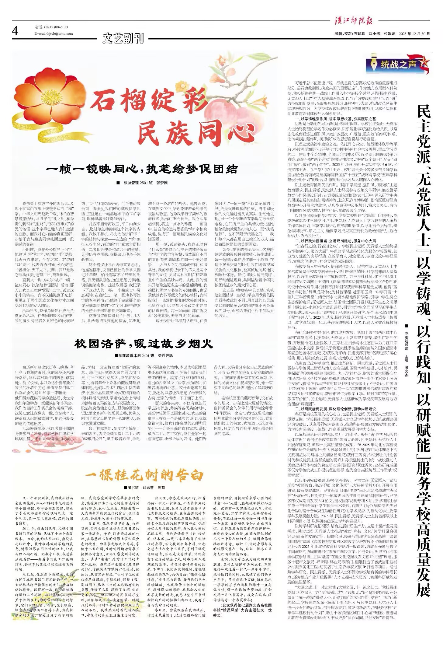 习近平总书记指出,“统一战线是党的总路线总政策的重要组成部分,是党克敌制胜、执政兴国的重要法宝”。作为地方应用型本科院校,我校始终将统一战线工作融入办学治校全过程,引导民主党派、无党派人士以“学”为基铸魂强作风,以“行”为要践知显担当,以“研”为径赋能促发展,在凝聚思想共识、服务中心大局、推动改革创新中展现统战作为,为学校建设教师教育特色鲜明的应用型本科院校和湖北教育强省建设注入强劲动能。